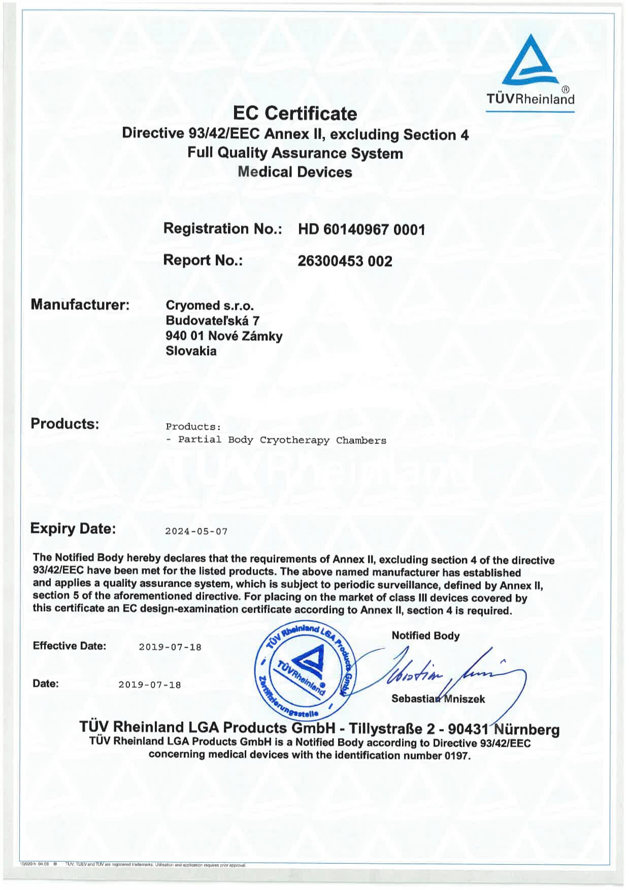Certyfikat ten potwierdza, że sprzęt firmy Cryomed jest zgodny z normami w zakresie BHP i ochrony środowiska zatwierdzonymi przez Unię Europejską. W naszym przypadku nie jest to samocertyfikacja, lecz dokument wydany przez jednostkę notyfikowaną na podstawie wyników badań.